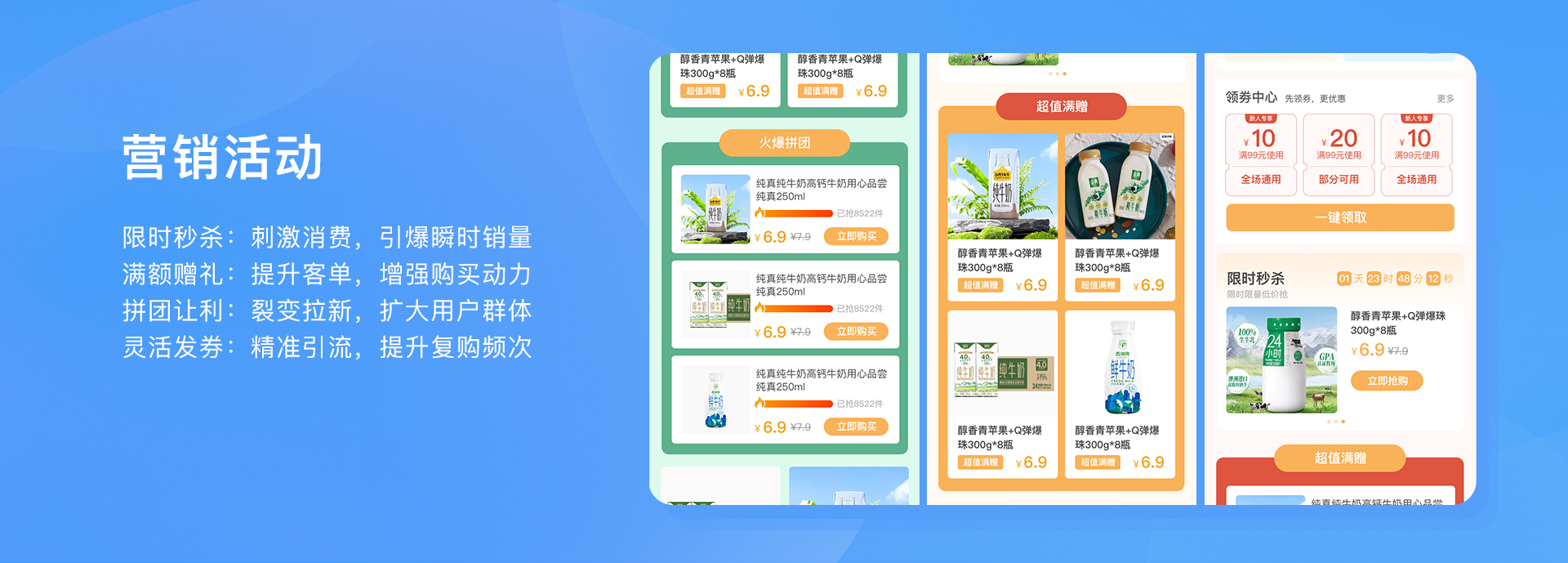 • 滿贈、秒殺、團購、優惠券多元促銷組合