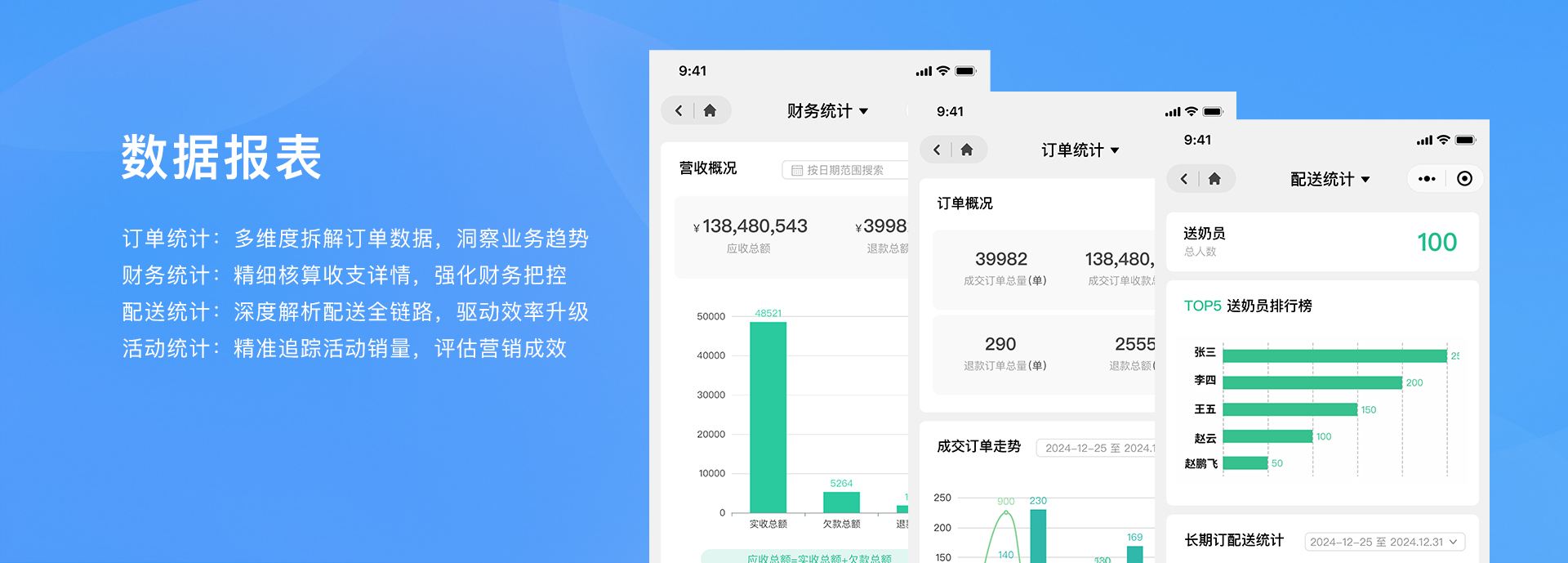 • 財務、訂單、配送、活動等多維度數據統計